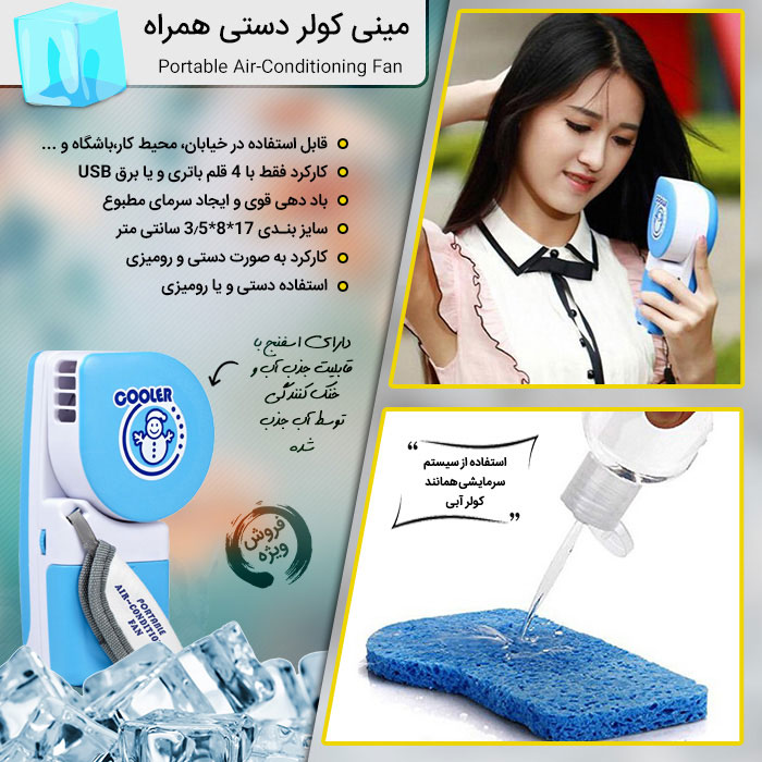 مینی کولر دستی همراه وسیله ای مناسب برای فصل گرماست که با استفاده از 4 عدد باطری یا برق یو اس بی کار میکند و قابل استفاده در منزل ، محل کار ، خیابان و ... می باشد. این مینی کولر در سه رنگ متفاوت ارائه شده است. اسفنج داخل این مینی کولر با قابلیت جذب آب خنک کنندگی بیشتری را به وجود می آورد.