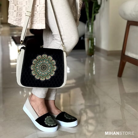 فرهنگ و تمدن هر کشوری نشان دهنده اصالت و قدمت آن است. امروزه مردم کشورهای غربی با چنگ و دندان پاسدار فرهنگ نه چندان قدمتدار خود هستند آنجا که ایران ما دارنده فرهنگی عمیق پر از نقش و نگار و خصوصیات اخلاقی ویژه است. این ست کیف و کفش علاوه بر جادار بودن کیف، و کفش فوق العاده راحت دارای نقش و نگاری است که برگرفته از فرهنگ ایرانی است. زیبایی این طرح نه تنها در ایران بلکه در تمام دنیا مورد پسند همگان است و زیبایی و جذابیت خاصی دارد که تحسین همگان را بر می انگیزد. کفش این ست در سایزبندی 37 الی 40 عرضه شده است که هنگام تکمیل فرم سفارش می توانید سایز مورد نظر را انتخاب کنید.